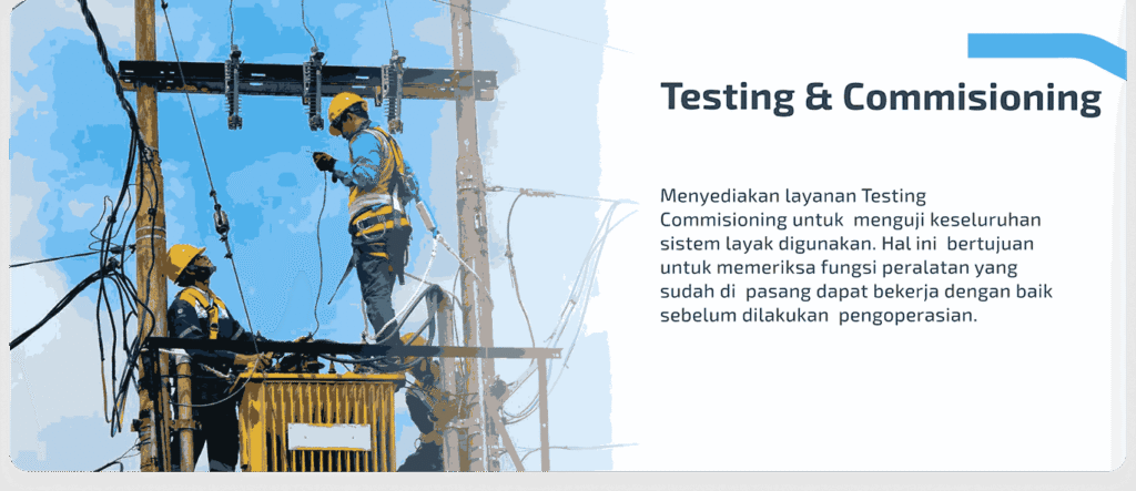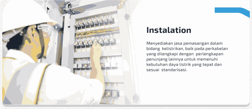 Sebagai salah satu perusahaan yang bergerak dalam menyediakan barang dan jasa dibidang elektrikal dan mekanikal. Kami melayani instalasi peralatan serta menguji keseluruhan sistem yang digunakan untuk kebutuhan kelistrikan.
